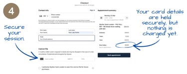 Add your card details to secure your session. You won't be charged and you can amend or cancel anytime up to 24 hours ahead.
